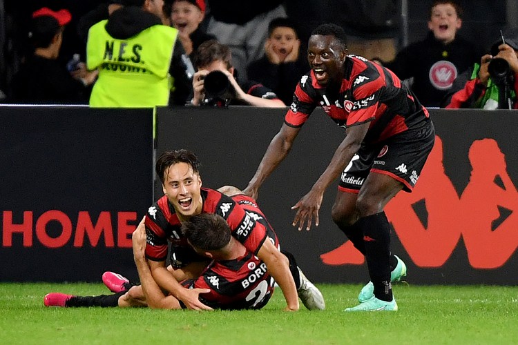 Aidan Simmons of the Wanderers celebrates with teammates after scoring a goal during the A-League Men’s soccer match between the Western Sydney Wanderers and the Wellington Phoenix at Commbank Stadium in Sydney, Friday, April 21, 2023. (AAP Image/Bianca De Marchi) NO ARCHIVING, EDITORIAL USE ONLY