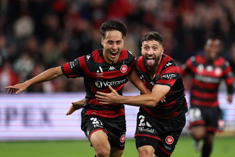 SYDNEY, AUSTRALIA – APRIL 21: Aidan Simmons of the Wanderers celebrates kicking a goal with Brandon Borrello of the Wanderers during the round 25 A-League Men’s match between Western Sydney Wanderers and Wellington Phoenix at CommBank Stadium, on April 21, 2023, in Sydney, Australia. (Photo by Cameron Spencer/Getty Images)